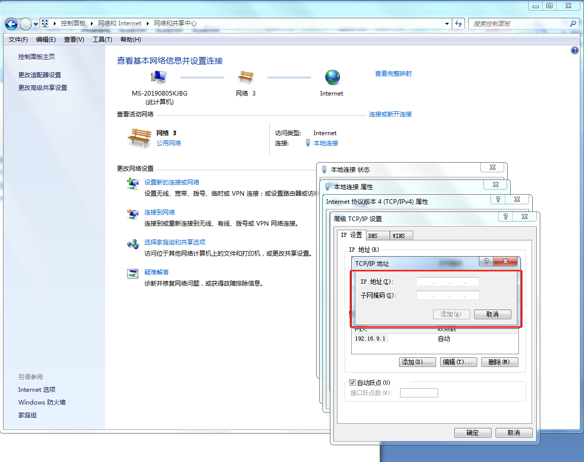 点击“开始 - 控制面板 – 网络和Internet - 网络和共享中心 - 更改设备适配器”找到物理网卡,鼠标右击“属性”,选择Internet 协议版本 4 (TCP/IPv4),点击“属性”,添加一个同网段IP。